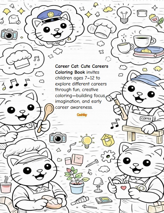 Coohfey.com has introduced a new digital coloring book designed for children aged 7–12, titled “Career Cat: Cute Careers Coloring Book.” The book is created as a printable and downloadable PDF, combining creative coloring activities with gentle learning about different careers in an engaging and child-friendly way.