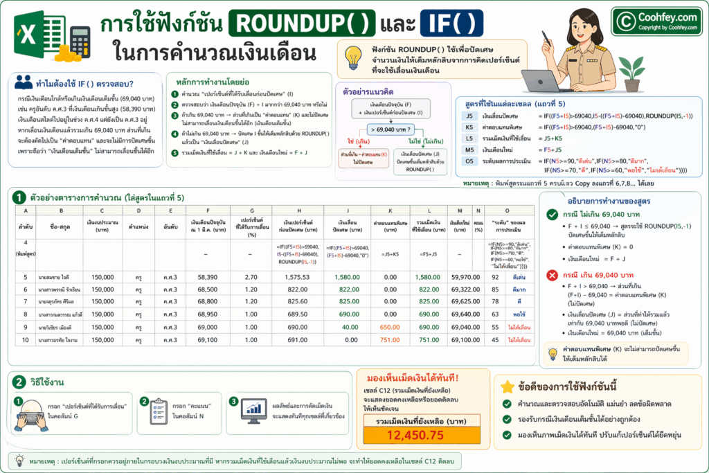 ฟังก์ชั่น ROUNDUP( ) ใช้เพื่อปัดเศษจำนวนเงินให้เต็มหลักสิบจากการคิดเปอร์เซ็นต์ที่จะใช้เลื่อนเงินเดือน