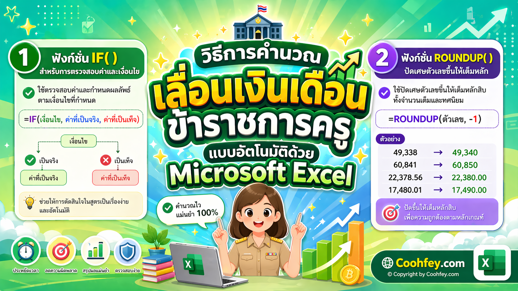 จากการที่แอดมินได้อธิบายถึงรายละเอียดและวิธีการคำนวณเพื่อเลื่อนเงินเดือนข้าราชการครูและบุคลากรทางการศึกษาโดยการใช้โปรแกรม Microsoft Excel ซึ่งได้อธิบายไปแล้วทั้งหมด 7 หัวข้อที่ผ่านมานั้น แอดมินหวังว่าบทความนี้จะเป็นประโยชน์ไม่มากก็น้อยต่อผู้ที่สนใจจะศึกษา หรือผู้อำนวยการโรงเรียน รวมถึงข้าราชการครู สายผู้สอนที่ต้องการทราบถึงวิธีการดังกล่าว หากท่านใดมีความคิดเห็นที่จะเสนอแนะต่อบทความนี้ก็สามารถ comment แนะนำได้ครับ. Coohfey Admin