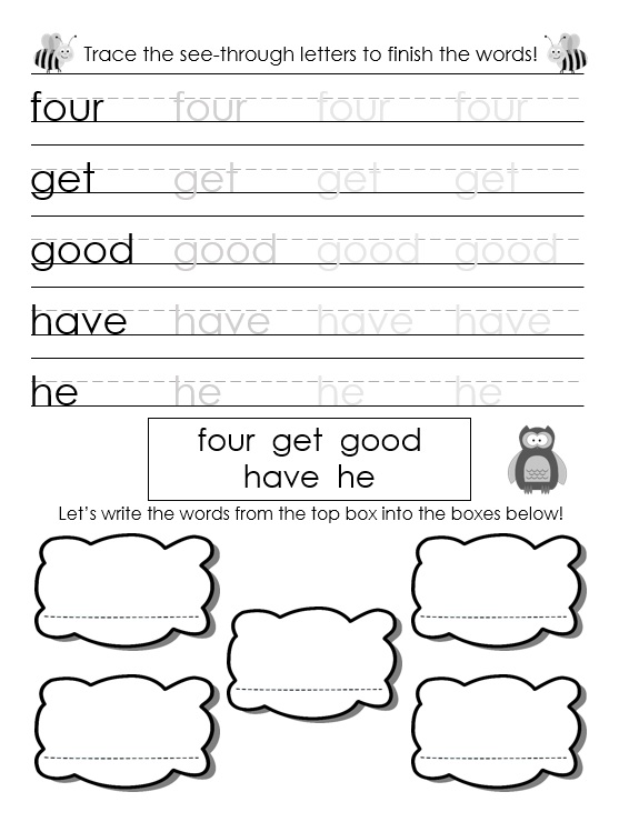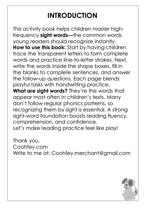 หนังสือเล่มนี้(ไฟล์ PDF)จะช่วยให้เด็ก ๆ คุ้นเคยกับคำศัพท์ที่พบเห็นบ่อยๆ เริ่มต้นด้วยการให้เด็ก ๆ เขียนตัวอักษรโดยการลากตามเส้นร่างเพื่อต่อคำให้ครบสมบูรณ์ ให้พวกเขาฝึกวาดเส้นให้เป็นตัวอักษร จากนั้นเขียนคำลงในกล่องรูปทรง จากนั้นก็เติมคำเพื่อให้ประโยคสมบูรณ์และตอบคำถาม
