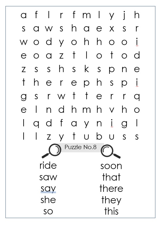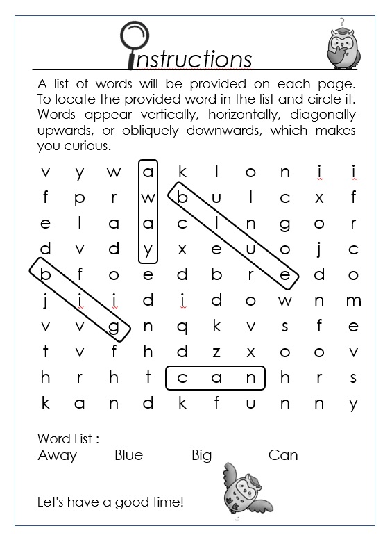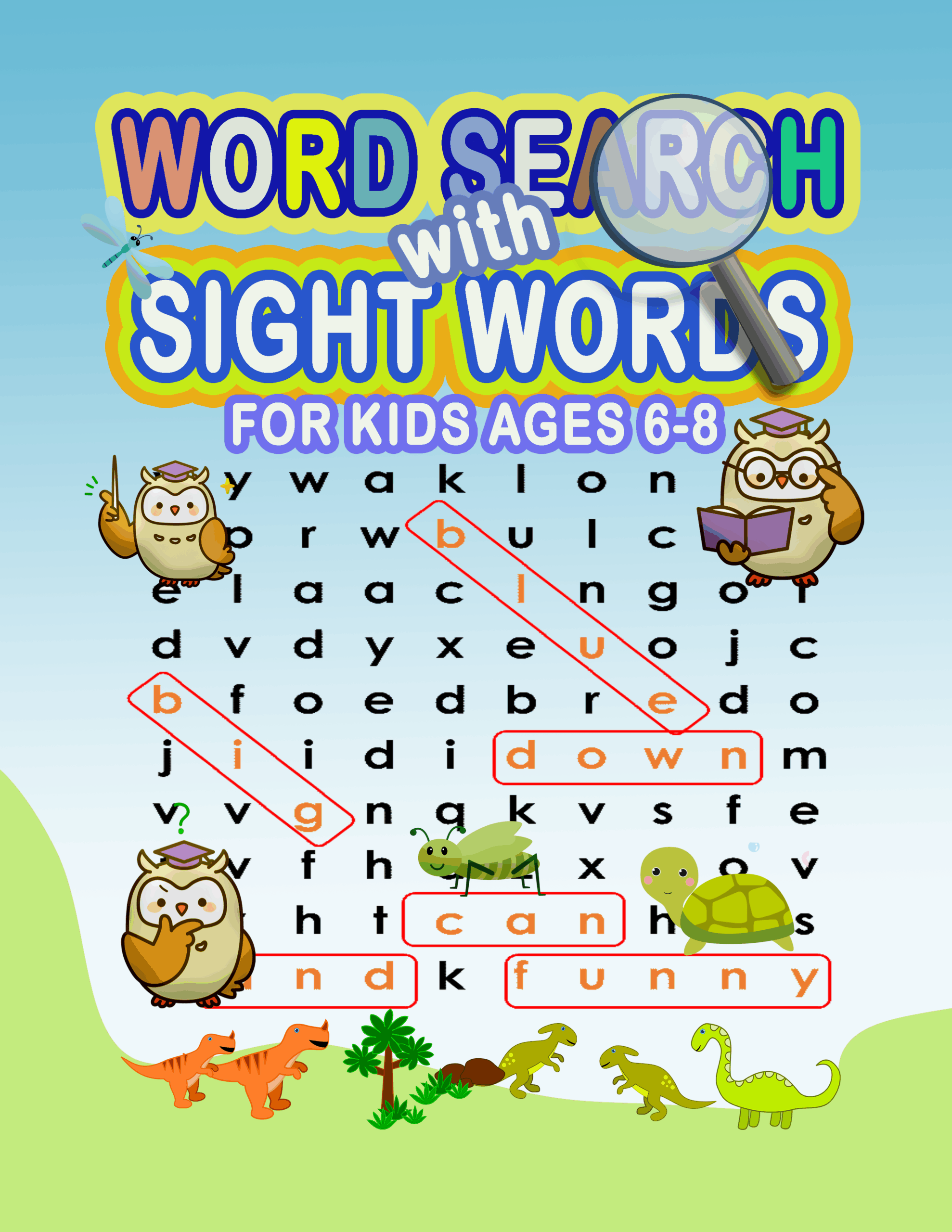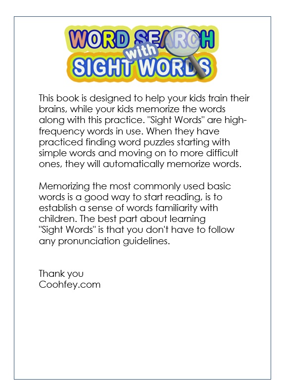 หนังสือเล่มนี้ออกแบบมาเพื่อช่วยให้เด็ก ๆ ได้ฝึกสมอง ขณะเดียวกันเด็ก ๆ ก็จะค่อย ๆ จดจำคำศัพท์ไปพร้อมๆกับการฝึกฝน คำว่า “Sight Words” คือคำศัพท์ที่พบเห็นบ่อยและถูกใช้งานบ่อยๆ เมื่อเด็ก ๆ ได้ฝึกทำแบบฝึกหัดค้นหาคำศัพท์ โดยเริ่มจากคำง่าย ๆ แล้วค่อย ๆ พัฒนาไปสู่คำที่ยากขึ้น พวกเขาจะสามารถจดจำคำศัพท์ได้โดยอัตโนมัติ การจดจำคำศัพท์พื้นฐานที่ใช้บ่อยๆ ถือเป็นวิธีการเริ่มต้นการอ่านที่ดี และเป็นการสร้างความคุ้นเคยกับคำศัพท์ให้กับเด็ก ๆ ข้อดีของการเรียนรู้ “Sight Words” คือ เด็กๆไม่จำเป็นต้องยึดตามหลักการออกเสียงใด ๆ เพียงแต่อาศัยการจดจำและความคุ้นเคยเป็นหลัก