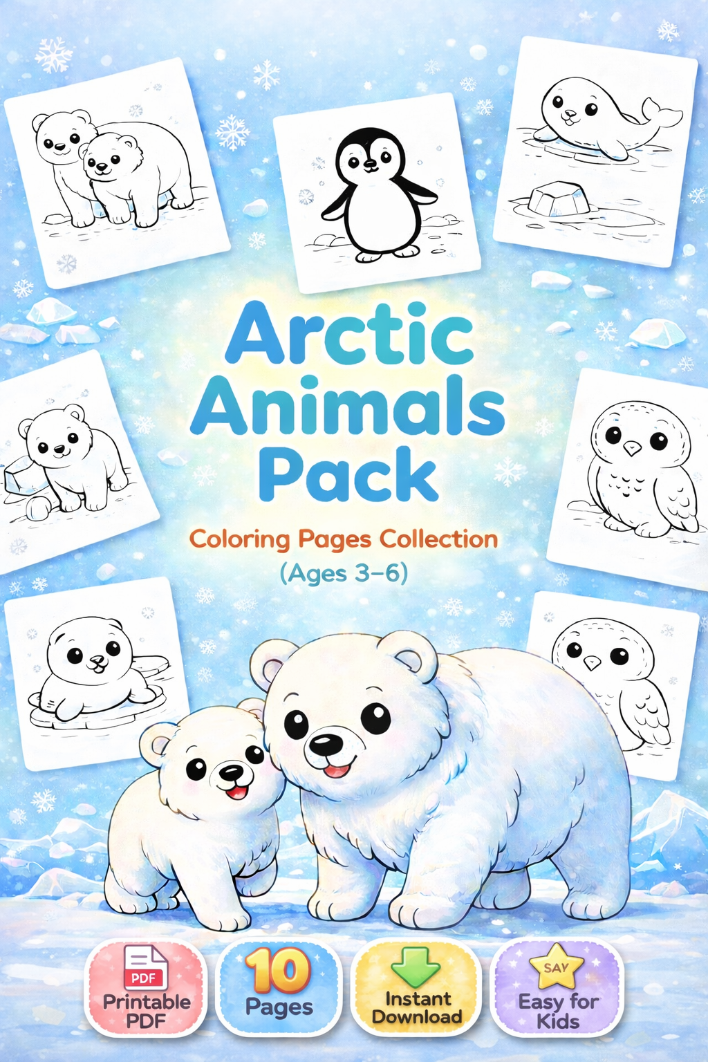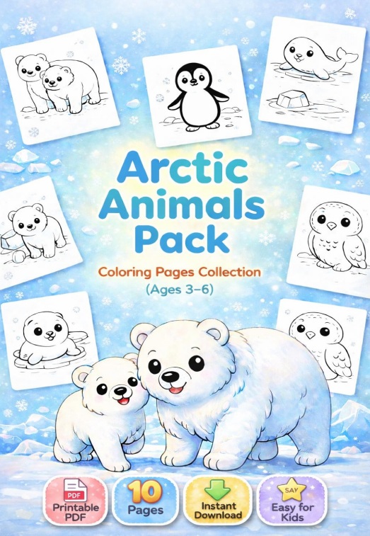 ชุดภาพระบายสีสัตว์ขั้วโลกสำหรับเด็ก(3–6 ปี)- Arctic Animals Pack เป็นไฟล์ PDF สำหรับดาวน์โหลด ที่ออกแบบมาเพื่อเด็กเล็กอายุ 3–6 ปี โดยเฉพาะ ภายในประกอบด้วยภาพสัตว์ในเขตขั้วโลก (Arctic) จำนวน 10 ภาพ เช่น หมีขั้วโลก เพนกวิน แมวน้ำ และสัตว์น่ารักอื่น ๆ