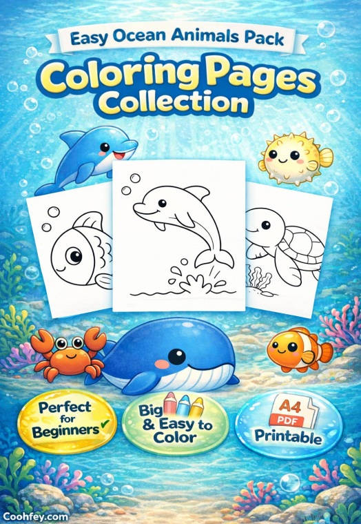 A simple and beginner-friendly ocean animal coloring set designed for kids ages 3–6.