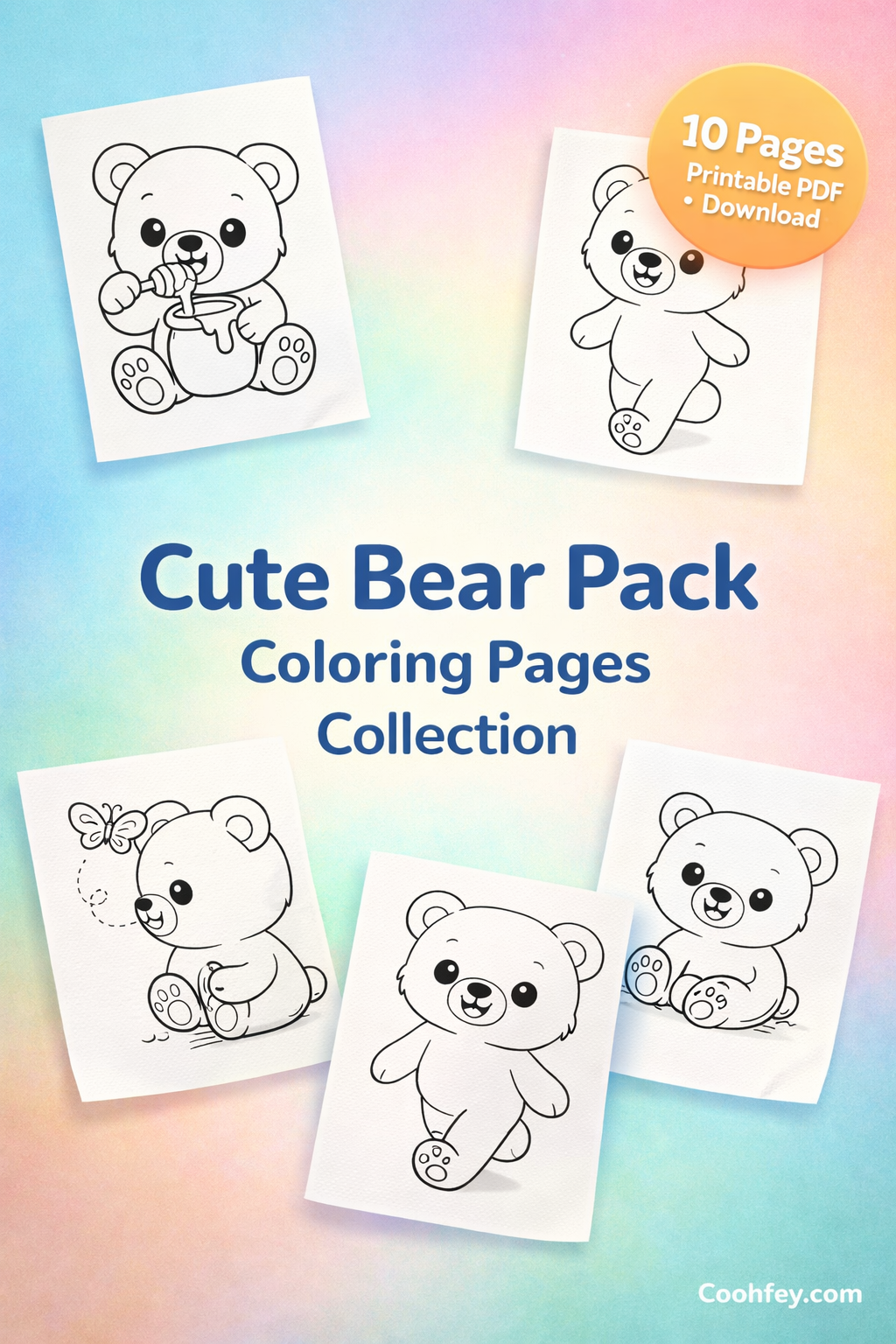 Cute Bear Pack – Coloring Pages Collection is a cute and simple coloring pack designed for children ages 3–6. Inside, you will find 10 fun bear-themed coloring pages featuring adorable poses such as sitting, walking, eating honey, sleeping, and playing.