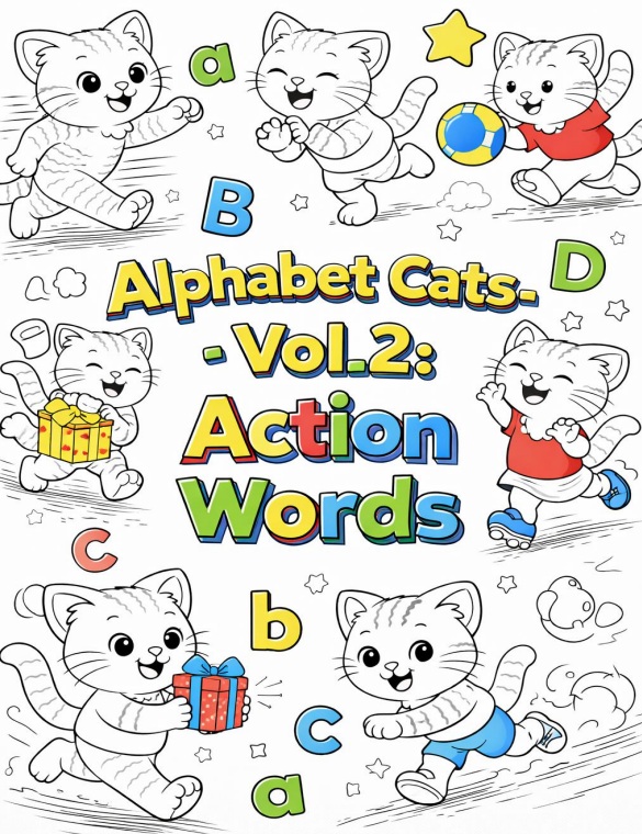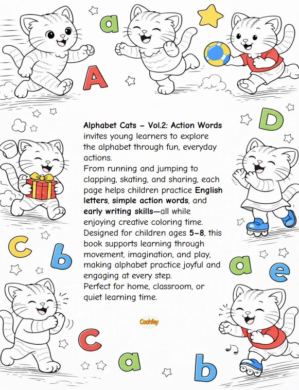 Alphabet Cats – Vol.2: Action Words is a fun and educational activity book designed to help young learners build English skills through action verbs, simple sentences, writing practice, and creative coloring.