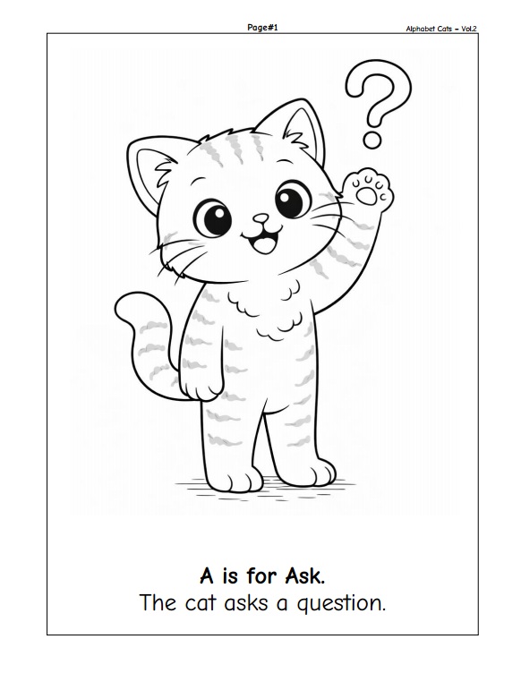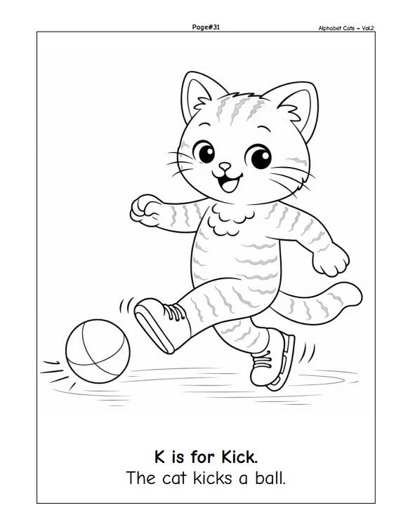 เด็ก ๆ จะได้เรียนรู้ตัวอักษร A–Z ผ่านภาพแมวน่ารักที่กำลังทำกิจกรรมต่าง ๆ เช่น วิ่ง กระโดด เต้น เล่นกีฬา และการเคลื่อนไหวในชีวิตประจำวัน พร้อมประโยคภาษาอังกฤษสั้น ๆ ที่เข้าใจง่าย เหมาะสำหรับผู้เริ่มต้น