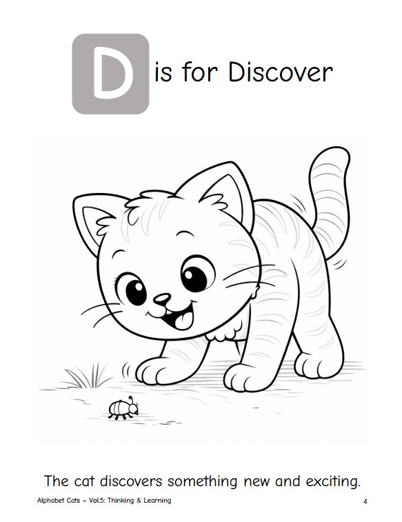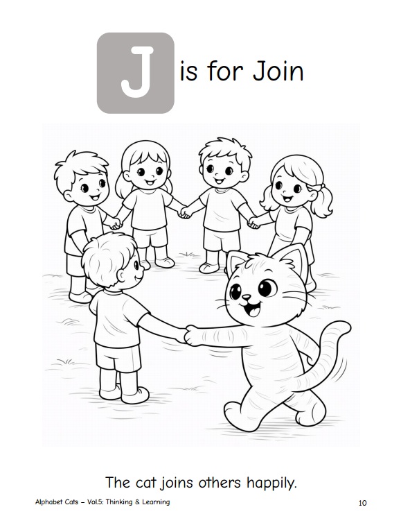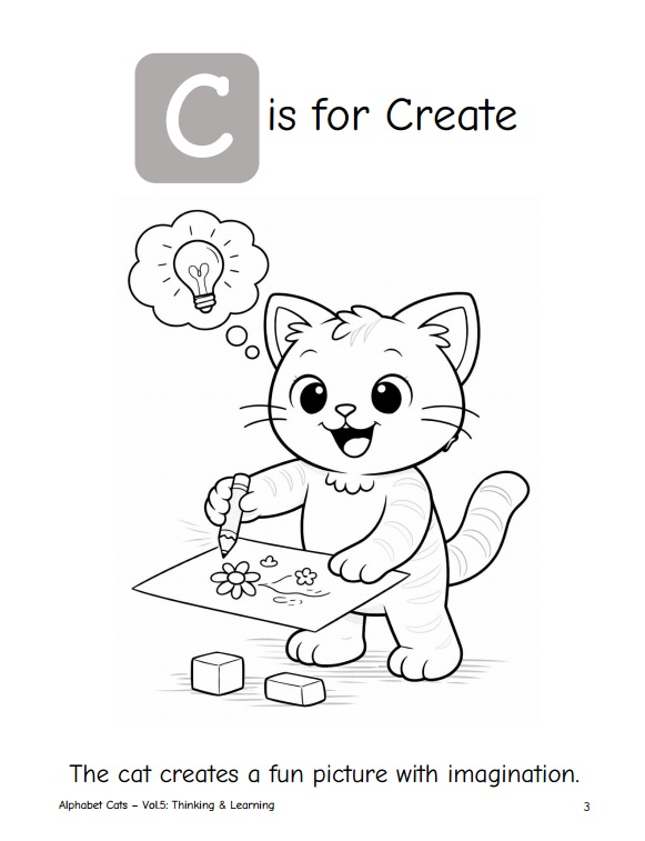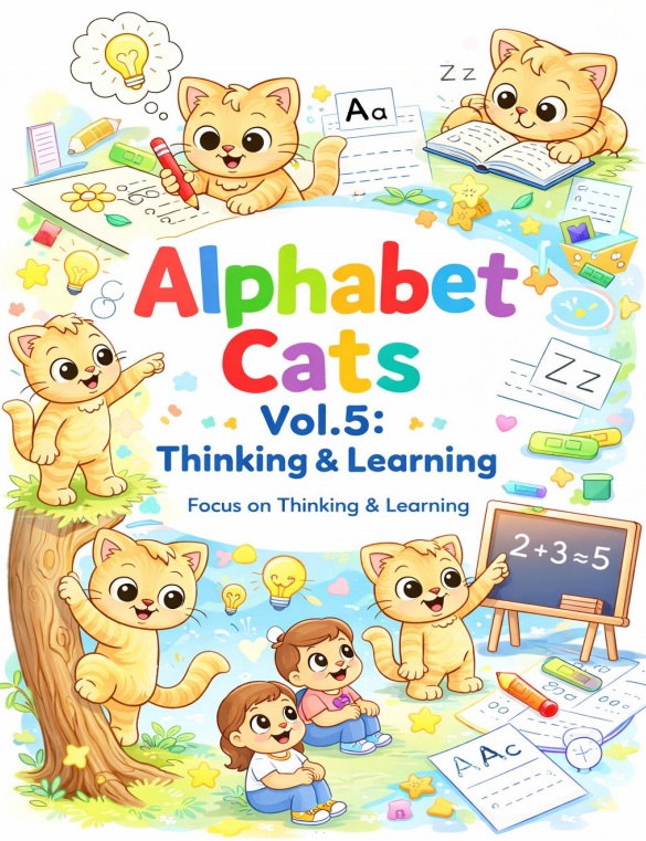The book gently introduces thinking and learning concepts through simple alphabet activities and calm coloring pages, featuring friendly Alphabet Cats characters.