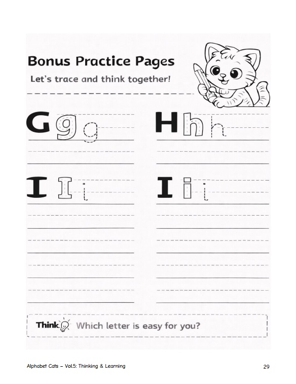 Alphabet Cats – Vol.5 is designed for everyday learning at a comfortable pace, combining simple activities with relaxing coloring.