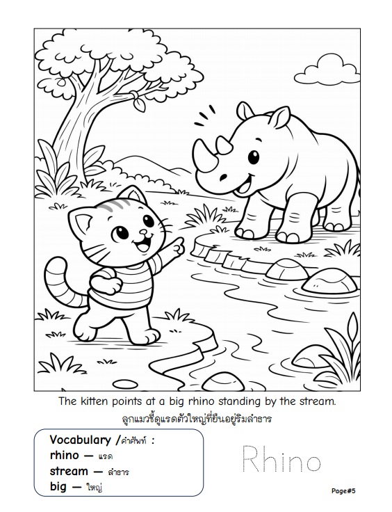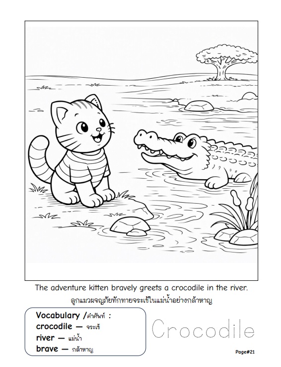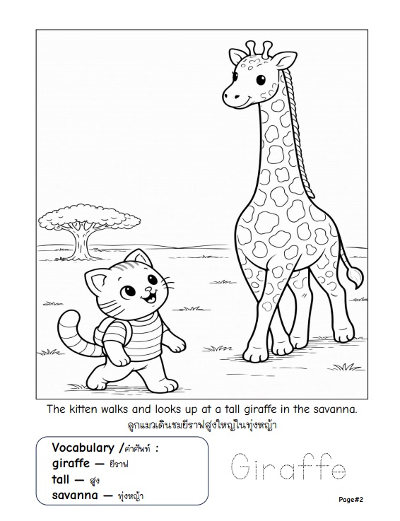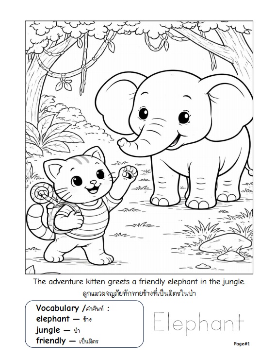 หนังสือระบายสีดิจิทัลสำหรับเด็ก ที่พาเด็ก ๆ ออกผจญภัยไปกับลูกแมวตัวน้อยเพื่อเรียนรู้เกี่ยวกับสัตว์ป่า ธรรมชาติ และคำศัพท์ภาษาอังกฤษ ผ่านกิจกรรมระบายสีที่สนุกและเข้าใจง่าย ภายในเล่มประกอบด้วยภาพลายเส้นระบายสี 30 หน้า ขนาด A4 แนวตั้ง เหมาะสำหรับเด็กอายุ 5–8 ปี โดยแต่ละหน้าจะมีภาพสัตว์ป่า พร้อมคำศัพท์ภาษาอังกฤษและคำแปลภาษาไทย ช่วยให้เด็ก ๆ เรียนรู้คำศัพท์พื้นฐานควบคู่กับการพัฒนาทักษะกล้ามเนื้อมือและความคิดสร้างสรรค์