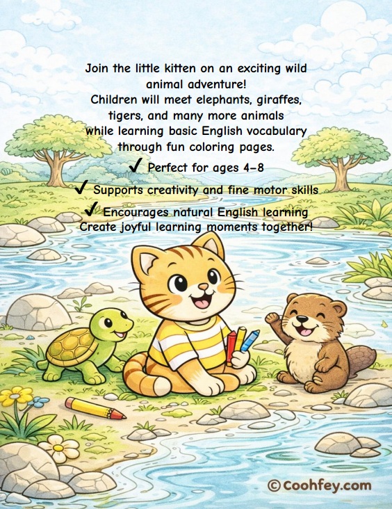 A digital coloring book that takes children on a fun adventure with a little kitten to explore wild animals, nature, and basic English vocabulary through engaging coloring activities.