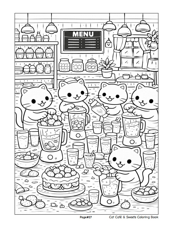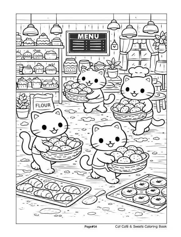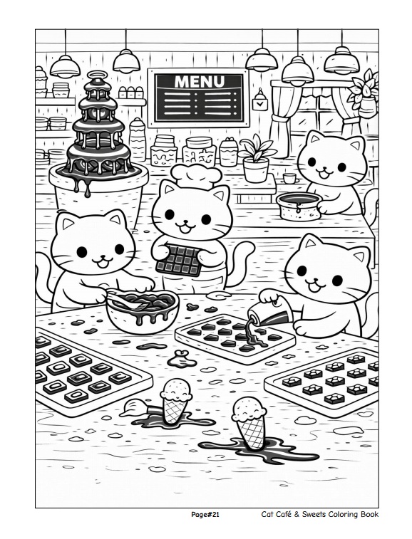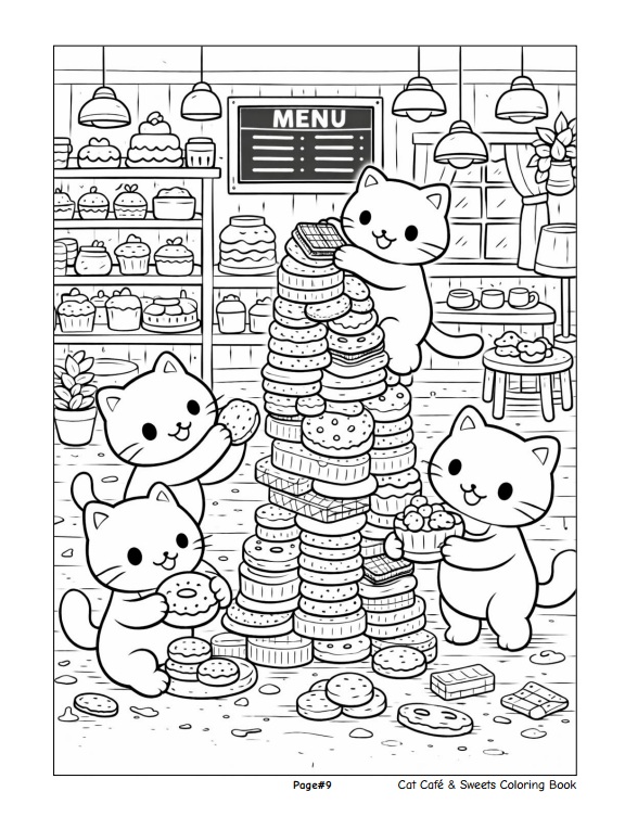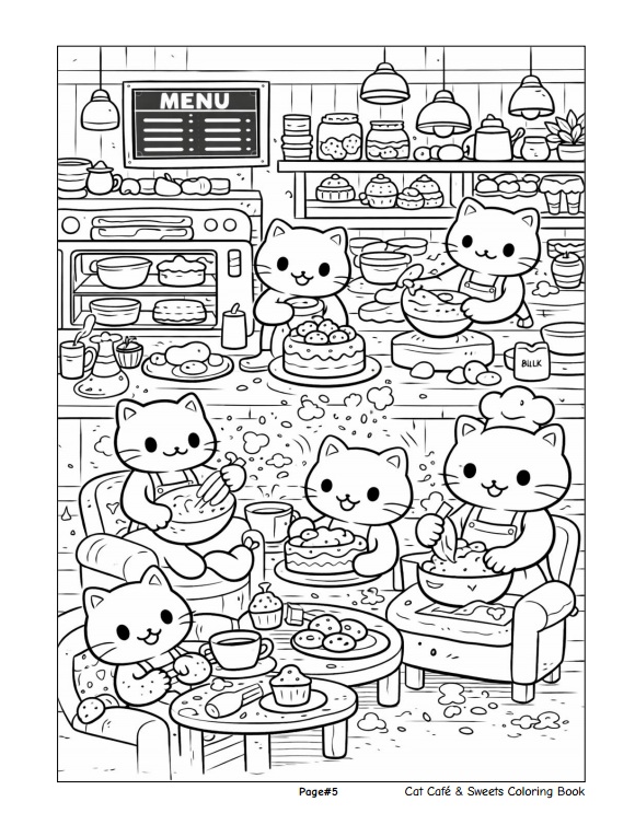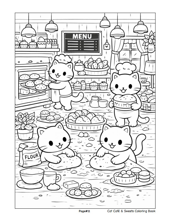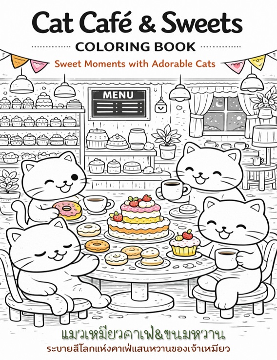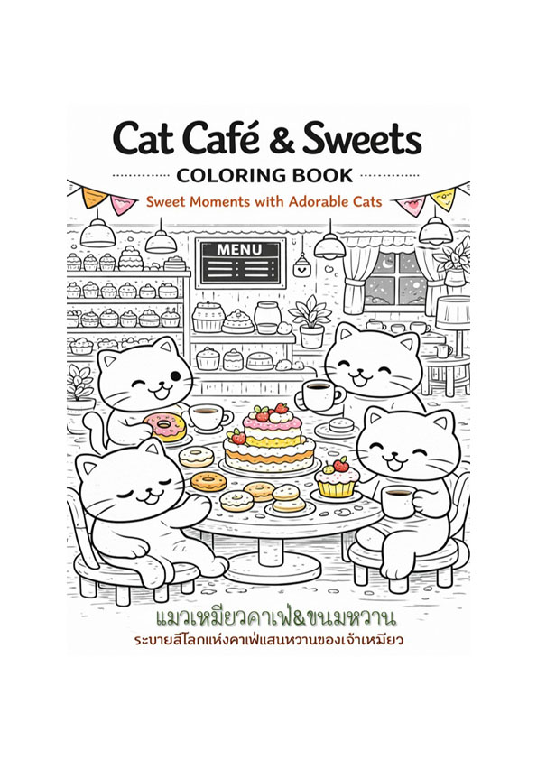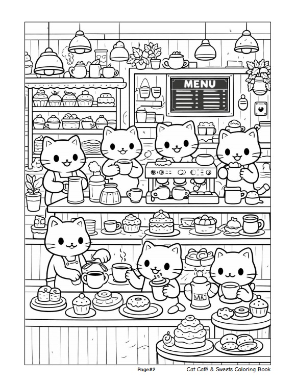 หนังสือเล่มนี้ประกอบด้วยภาพลายเส้นขาว–ดำจำนวน 50 ภาพ ถ่ายทอดบรรยากาศคาเฟ่อบอุ่นที่เต็มไปด้วยเหล่าแมวเหมียวน่ารัก เค้ก โดนัท คัพเค้ก และขนมหวานหลากหลายรูปแบบ พร้อมฉากกิจกรรมสนุก ๆ ภายในคาเฟ่ที่ออกแบบมาเพื่อเด็กโดยเฉพาะ