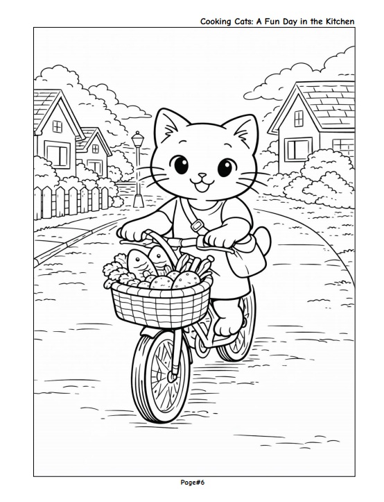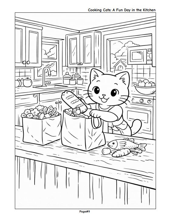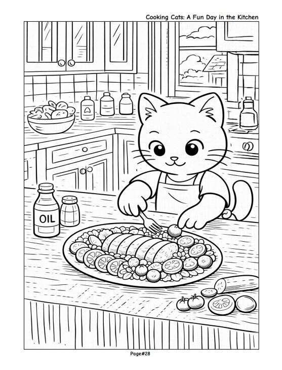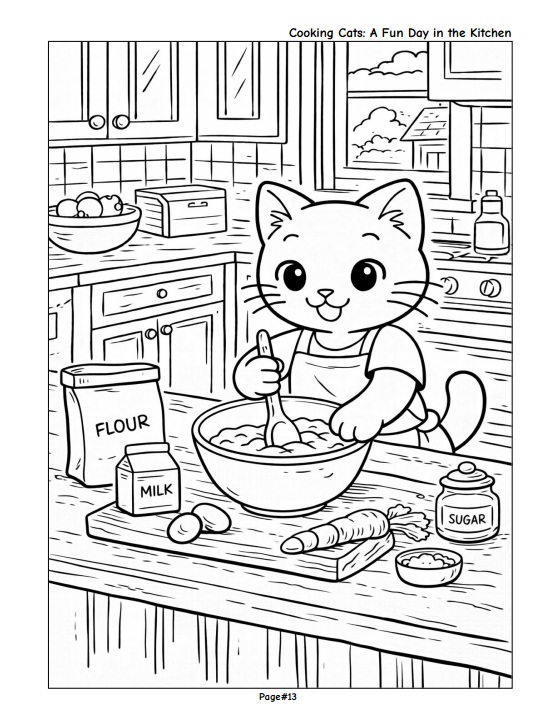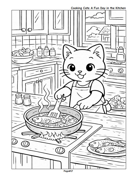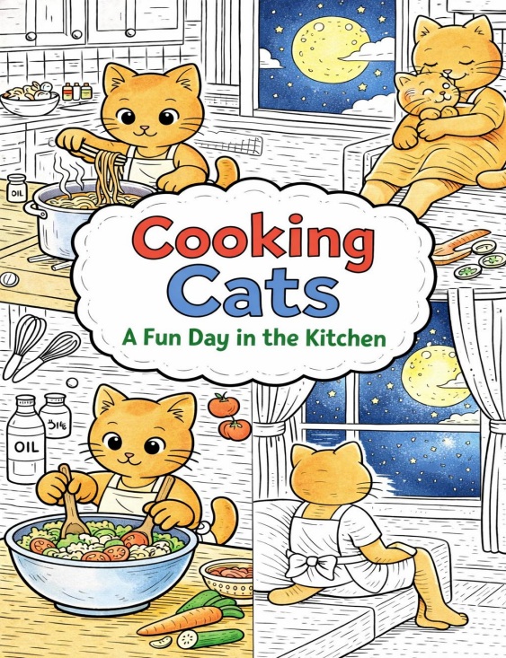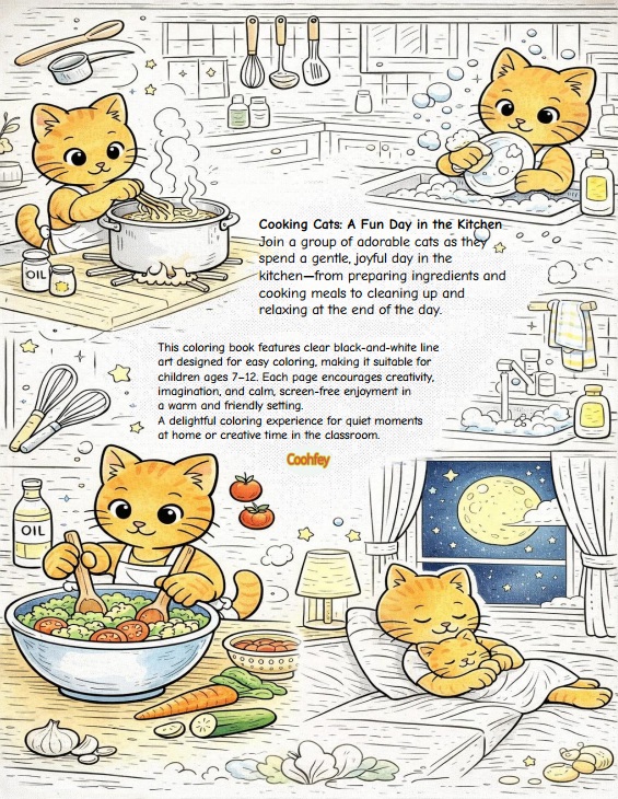 Enjoy a delightful coloring experience with adorable cats as they spend a full day in the kitchen—from preparing ingredients and cooking meals to cleaning up and relaxing at the end of the day.