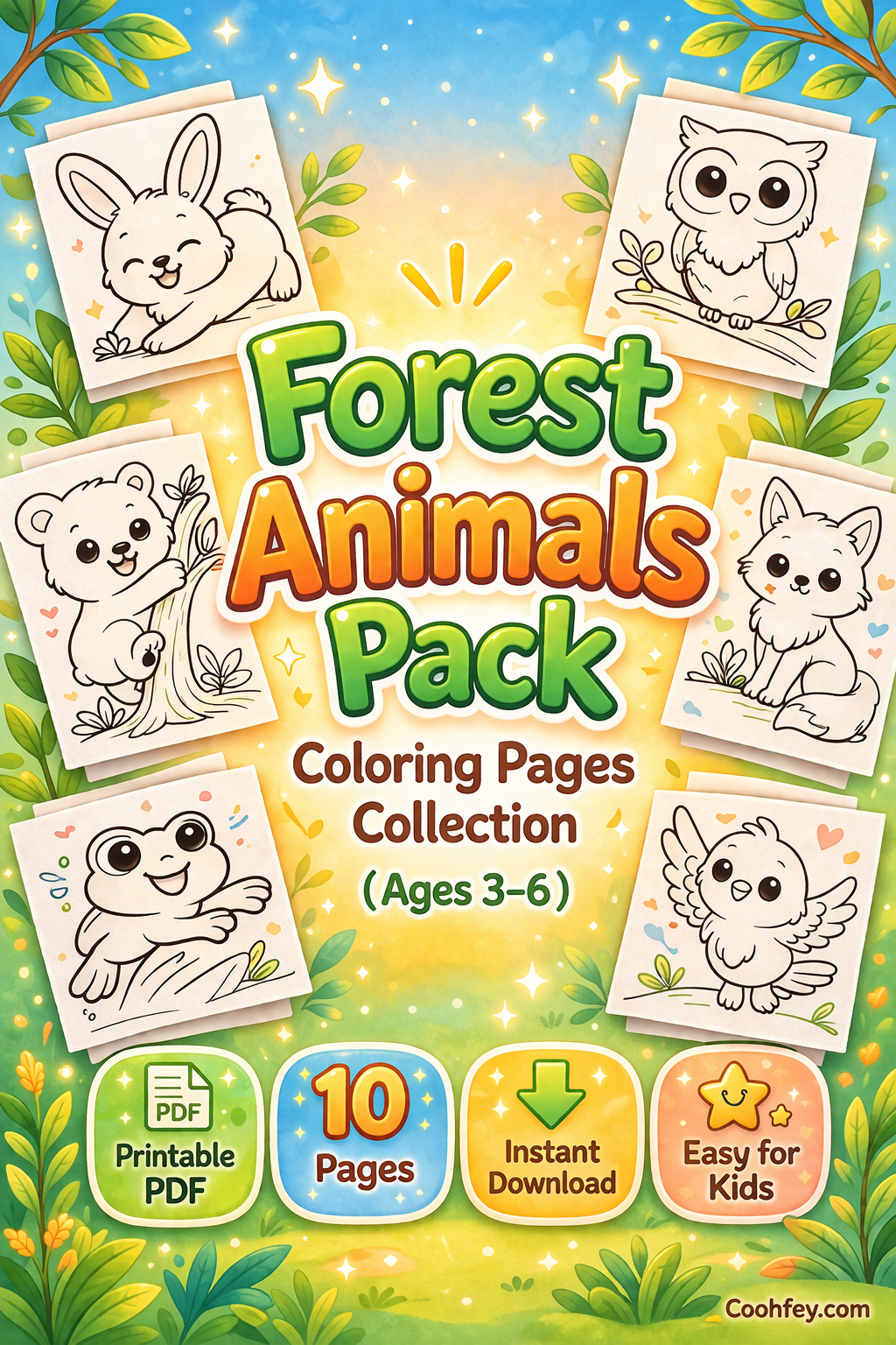 The “Forest Animals Pack” is specially designed for young children (ages 3–6), featuring simple, bold, and clean line art that is easy to color and enjoyable for beginners.
