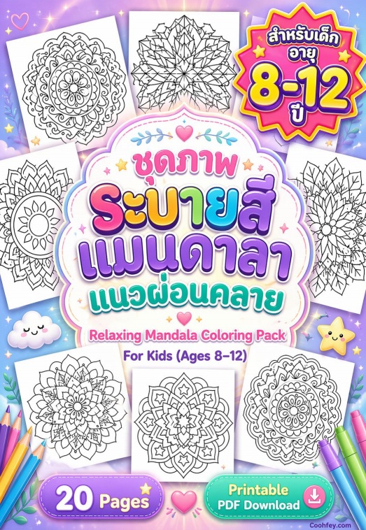 ชุดภาพระบายสีแมนดาลาแนวผ่อนคลาย สำหรับเด็ก (8–12 ปี)