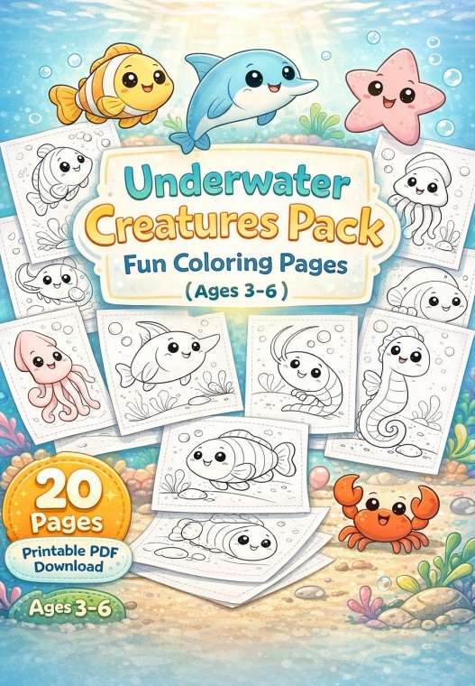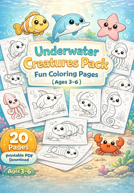 Underwater Creatures Pack Fun Coloring Pages (Ages 3–6) is a delightful ocean-themed coloring set designed especially for young children. It features cute underwater animals such as fish, dolphins, octopuses, sea turtles, and more—perfect for inspiring creativity and early learning.