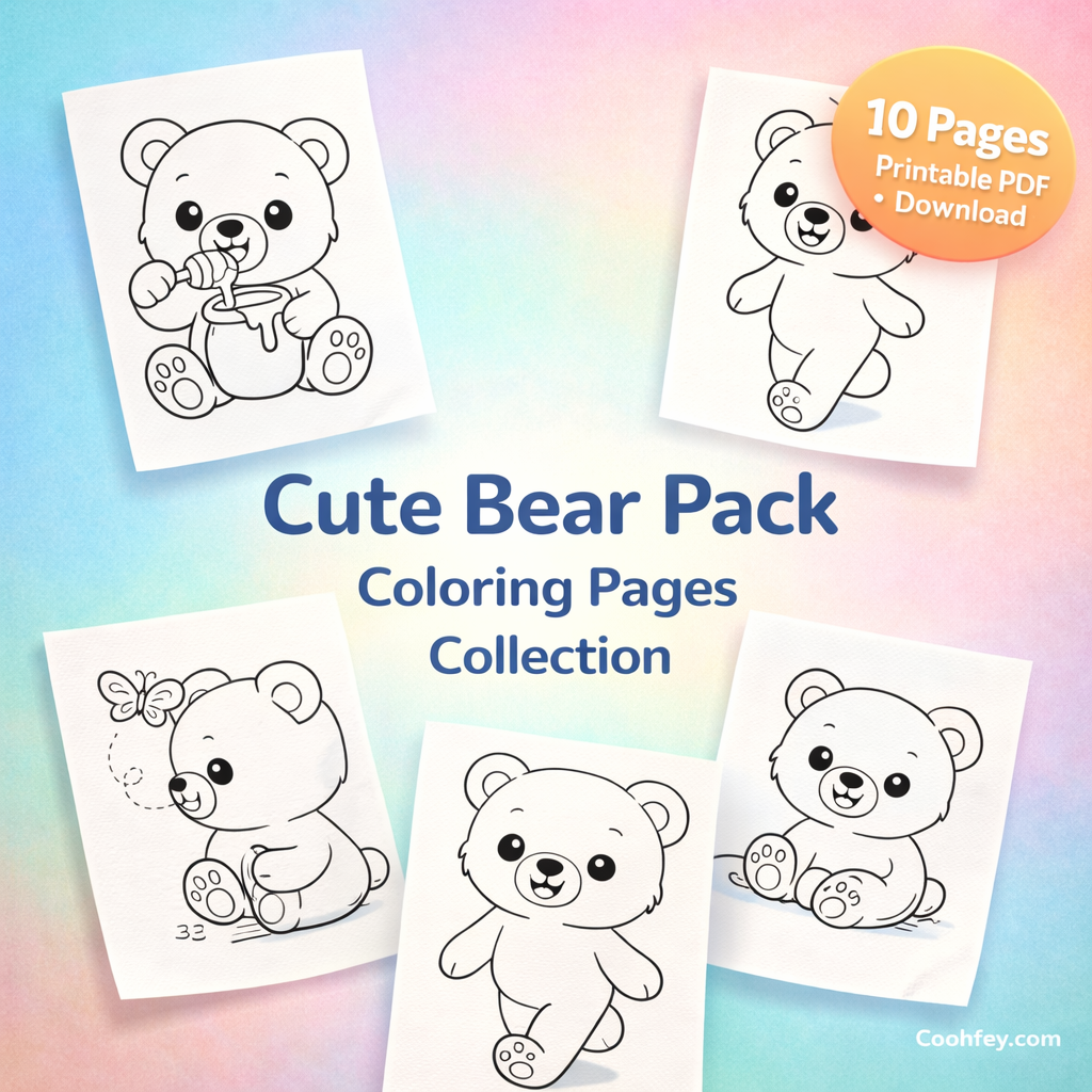 🧸 Cute Bear Pack – ภาพระบายสีหมีน้อยสำหรับเด็ก 3–6 ปี